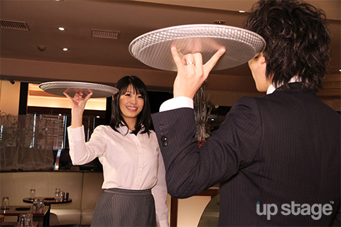 スタッフさんは余裕でスイスイ歩いていっちゃうし、慣れると2段重ねなんかも出来ちゃうんですよね。持ち方のコツは「手首を前に向けて、親指、人差し指、小指で支えること」ですって!