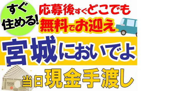 - \宮城県で新生活はじめよう!/ 勤務地:宮城県一円にあり ★どこからでも応募OK! 宮城までの交通費は【0円】 お近くまでお迎えに行きます! ★すぐに住める【寮完備】 家具家電つき・ご飯も3食付いて快適♪ Wi-Fiもあり!カバンひとつで入居OK!