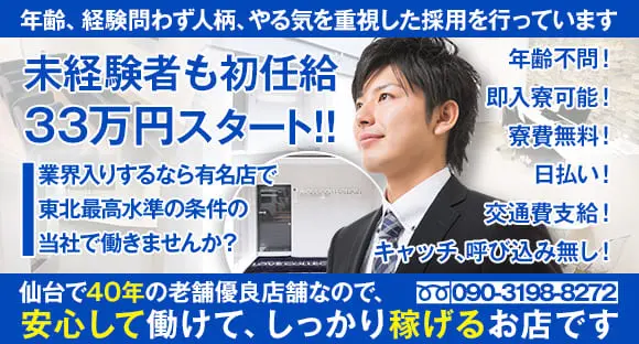 初任給33万以上可能!1R個室寮完備!日払い5千円!年齢不問!交通費支給!社会保険完備!40年営業の老舗優良店舗なので安心!業界入りするなら有名店で東北最高水準の条件の当社で働きませんか?