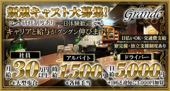 【正社員・アルバイト募集】 駅からすぐのスナックGrandeでは、黒服と送迎ドライバーを募集中! 未経験の方、中高年の方も活躍可能です◎ 日払いOK、交通費支給、駐車場完備など、安心して働ける待遇が充実。 寮も完備しているので遠方からの応募も安心です。 まずはお気軽に体験入社してみませんか?