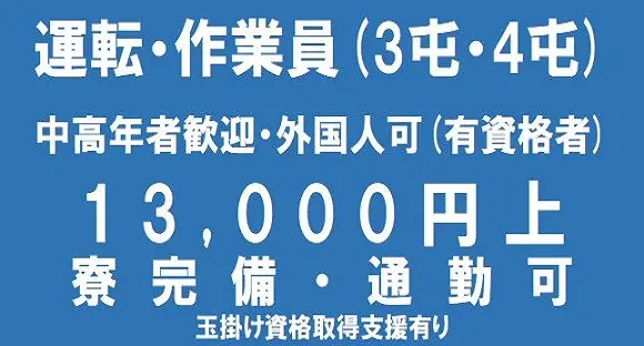 作業員(運転土工、3屯・4屯)玉掛け資格取得支援有り