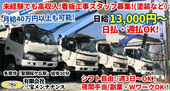 【日払い・週払いOK・副業・WワークOK】未経験から月給40万円以上可!看板工事スタッフ★週3日~/社員登用あり◎看板工事スタッフ大募集!安定して長く働ける職場です♪