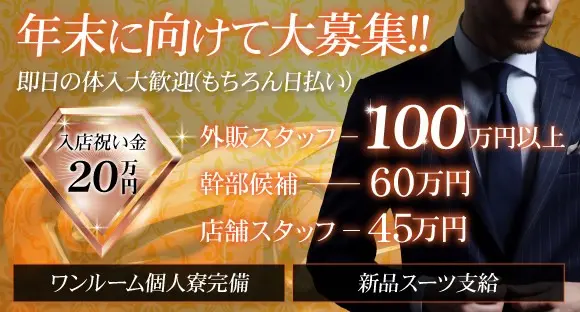 10月3日グランドオープン!おかげさまで大反響です。年末に向けてさらにスタッフ大募集。新品のスーツと入店祝い金20万円をご用意してお待ちしています。その他にも外販スタッフも月給100万円以上で同時募集