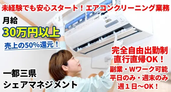 未経験からでも安心スタート★売上の50%をそのまま還元!直行直帰&自由シフトで副業・本業どちらも両立可能なエアコンクリーニング業務♪