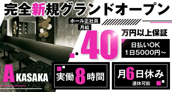 実働8時間で休みは月6日!しっかり仕事とプライベートを分けれるので仕事してる時の熱量変わります!無駄に長い勤務時間、連日出勤は当店ありえません!短時間で売上作って、休みは遊んで、毎月高額お給料をもらう!