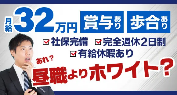 昼職に負けない待遇・条件を揃えました!昼職からの転職・異業種からの転職大歓迎!安定感のある職場です!飲食や接客経験者の方は優遇します!