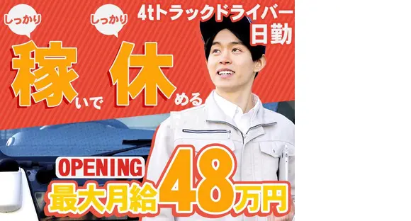 <オープニング!>有休消化率90%!連休取得OK&月収48万円も可能な【4tドライバー】<経験を活かして上を目指せる!>