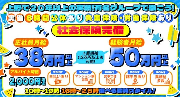 【日払い可・寮完備】上野で『営業年数NO.1クラス』のグループです!長くお客様や働く女の子に支持され続けています!!働きやすさ抜群! 経験者も未経験者も大歓迎!やりがい充分の当社で一緒に働きませんか?