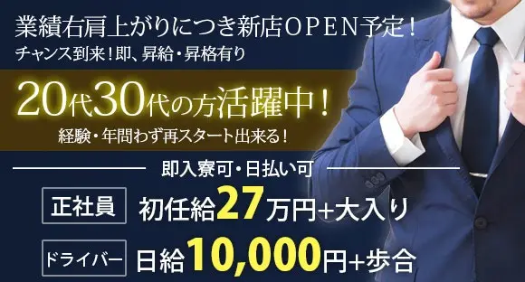 急募。20代・30代の方活躍中!経験・年問わず、今なら再スタート出来る!業績右肩上がりにつき続々新店OPEN予定!初任給27万円+大入り(日払い可能)随時、昇給・昇格有り