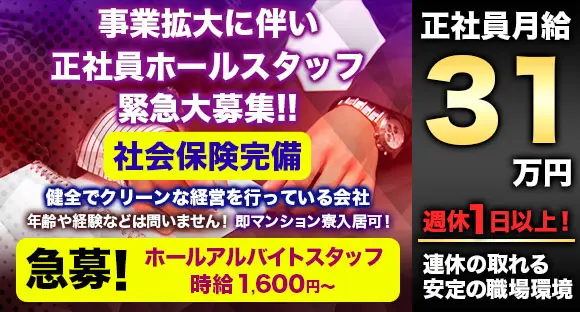 【急募】正社員ホールスタッフ月給31万円!見習い期間月給30万円 即採用OK!社会保険完備!反社会勢力等の付き合いは一切ございません。ナイトワークへの印象が変わるお店です!