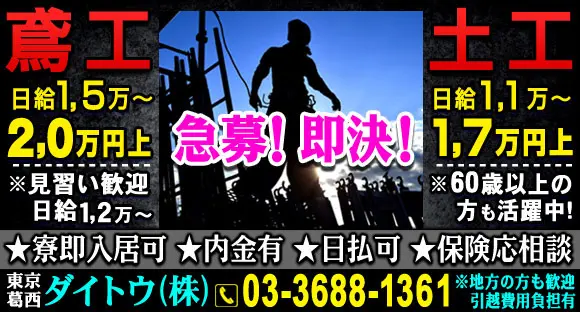【鳶・土工】●現場多数・多忙につき安定高収入●鳶(経)1・4万~(未)1・25万~●土工(未)1万~●地方歓迎●寮即入可【夜間作業有】【寮管理同募】