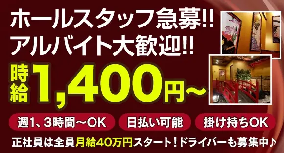 都内でも最大規模の人気店『紅』で一緒に働きませんか?アルバイト急募!週1日~、1日3時間~OK♪時給は1,400円~で日払いOK☆正社員は未経験者でも必ず月給40万円スタート!個人寮完備、日払いOK!