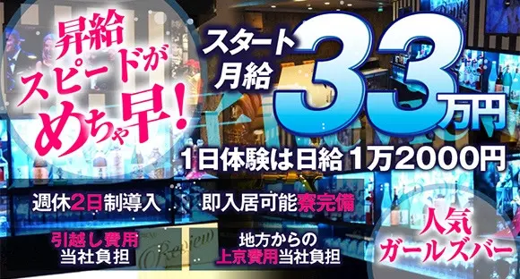 未経験スタート月給33万円以上!昇給スピードハンパない!入社にあたり当社費用負担有!マンション寮完備!週休2日制!大型連休有!ガールズバーでナイトワーク学んで将来は独立可能!1日体験日給1万2000円