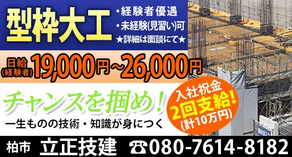 ★入社祝い金は二回支給(3ヶ月/6ヶ月)★ 業界屈指の高給職【型枠大工】経験者の初給は『19,000円~26,000円以上!』ガッツリ稼げます! ●見習いでも日給『15,000円以上!』→昇給随時!