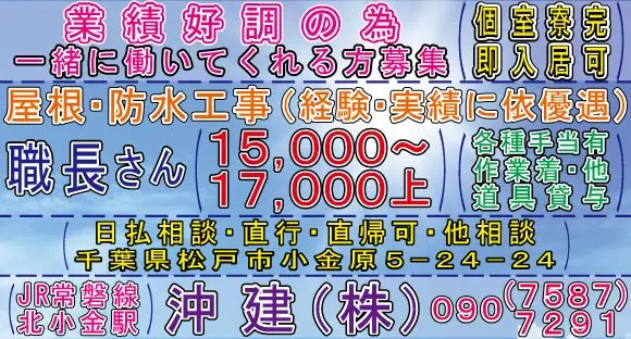 【屋根・防水工事スタッフ募集!】未経験スタートでも、一人前に育てます★ ☆寮完備:地方からの応募も大歓迎☆ 日払い対応★