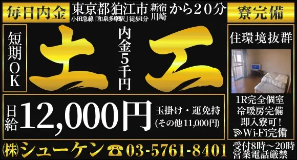 住み込みで働きたい方、土日休みたい方、短期で稼ぎたい方にオススメの企業です!今すぐ働きたい方も大歓迎!!また事務所は駅から徒歩1分の好立地!東京・神奈川からアクセスしやすいです☆内金も入寮者は5,000円、通勤者は10,000円なのでお金に困ることはありません☆