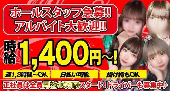 安心の大手有名店♪アルバイト急募!週1日~、1日3時間~OK♪掛け持ち・副業に最適☆日払いOK!時給は1,400円~♪正社員は全員月給40万円スタート、1R個人寮完備、日払いOKです!