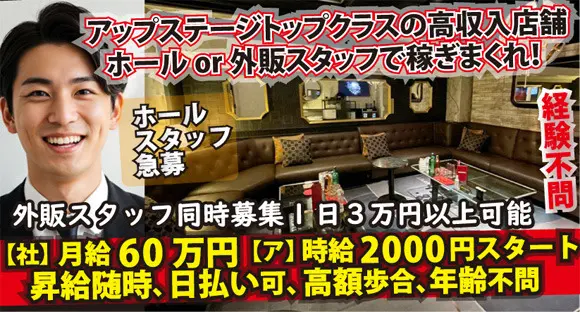 経験・年齢・性別不問!ホールスタッフは未経験でも月給60万円スタート!外販&アルバイトも急募!破格の高収入を目指すならご連絡ください!!未経験からでもしっかり稼げるお店です。とにかく稼ぎたい方必見!どなたでも活躍できる環境です!