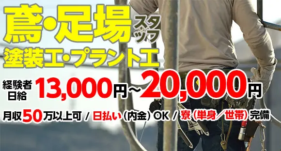 【鳶工】【塗装工】【プラント工】【荷役】未経験から職人さん(経験者)まで大募集中! ★単身用・世帯用社宅あり★ 遠方からの応募も大歓迎