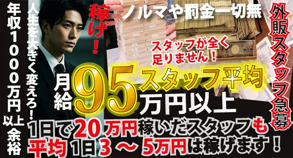 - 1日、3万円程度はほぼ無理なく稼げます!1日6~7時間、週5日勤務で月給60万円~80万円が目安です。完全歩合制となり、勤務時間は自由ですので、更に稼ぎたい方は月給90万円~100万円も目指せます。(ほとんどのスタッフが月給100万円近く行きます)また、最初は思ったように稼げなかったりもしますので、日給での保証もご用意しております。