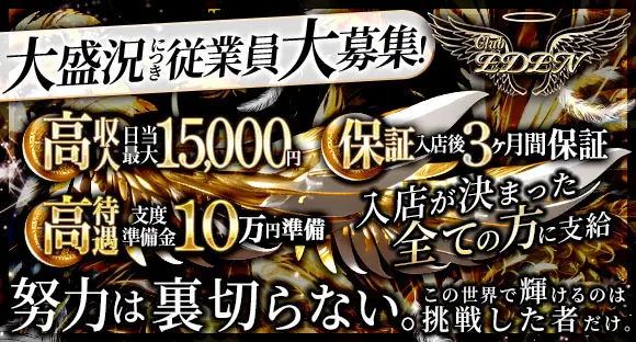 今のお店よりも上を目指したいあなた 次は Club EDEN で経験が君の翼となる 中洲で光を放つ 次なる舞台でさらなる高みへ 3ヶ月間 売上100%バック! 売上・知名度・待遇 UP 全て今以上をお約束します!