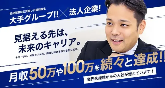 月収50万や100万を続々達成!業界トップクラスの大手グループ&法人企業で、安心して働ける充実した福利厚生を提供。